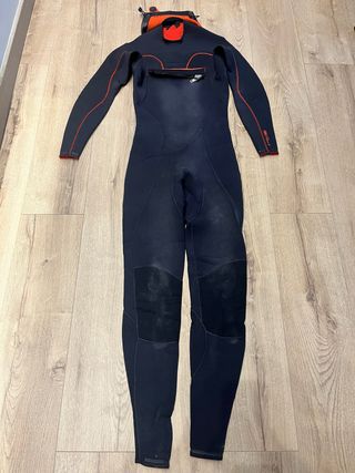 Traje de neopreno Tribord (Decathlon) de cuerpo entero, ideal para surf, paddle surf, bodyboard, windsurf o kitesurf. Diseñado para aguas templadas y frías (aprox. entre 12 °C y 18 °C), combina buen aislamiento térmico con gran libertad de movimiento. 🔸 Características: • Grosor aproximado: • Cremallera frontal (chest zip) que mejora el ajuste y reduce la entrada de agua. • Costuras GBS (pegadas y cosidas) para mayor durabilidad y estanqueidad. • Refuerzos en rodillas para resistir el roce con la tabla. • Cuello y puños ajustados para limitar filtraciones. • Interior suave y cómodo. • Color negro con detalles naranjas.