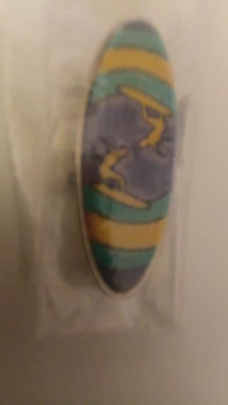 Preciosa miniatura de tabla de surf, ideal para coleccionistas. - Diseño vintage con colores llamativos. - Forma ovalada. - Perfecta para decorar.