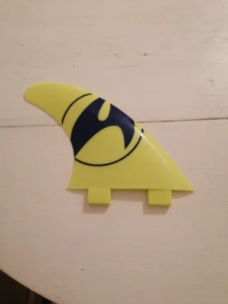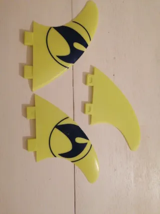 Set de tres quillas amarillas para tabla de surf, marca Fulcas. - Modelo Trifin. - Sistema de anclaje FCS. - Diseño con logo en azul.