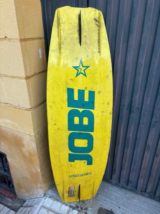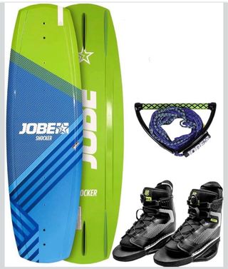 Equipo completo para wakeboard de la marca Jobe. - Tabla de wakeboard con fijaciones. - Chaleco salvavidas Jobe de color verde y negro. - Cuerda de arrastre con asa. Fijaciones Talla 39-47 ajustable a todo tipo de pies. El material se ha usado muy poco.