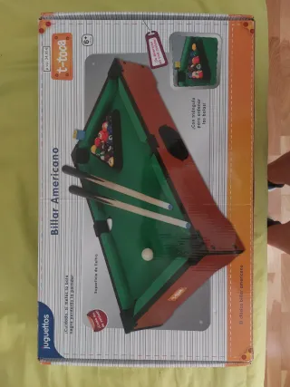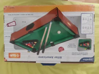 Divertido billar americano infantil de la marca t-toca. Ideal para los más pequeños. - Incluye bolas y tacos. - Superficie de fieltro. - Con triángulo para ordenar las bolas.