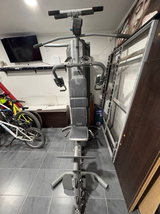 Máquina de ejercicio multifunción para entrenar en casa. Permite realizar una gran variedad de ejercicios. - Estructura robusta de acero. - Asiento acolchado. - Empuñaduras ergonómicas.