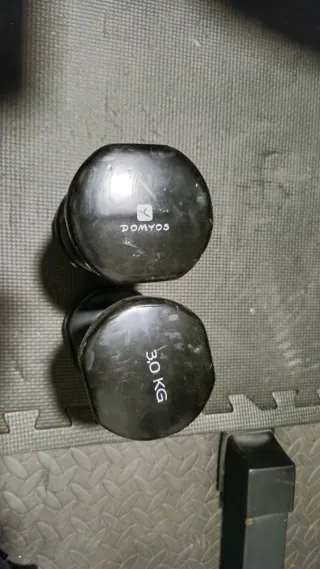 Par de mancuernas ajustables con discos de plástico. Ideal para proteger el suelo por si se cae un disco - Peso total: 10kg. - 4 Discos de 2.5kg cada uno. - 4 Discos de 1,25kg - 4 Discos d 0,25kg - Cierre de rosca para asegurar los discos.