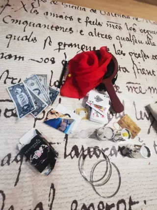 Set de juegos de magia de la marca Borras. Incluye varios elementos para realizar trucos. - Baraja de cartas. - Pañuelo rojo. - Varita mágica. - Monedas. - Aros de metal.