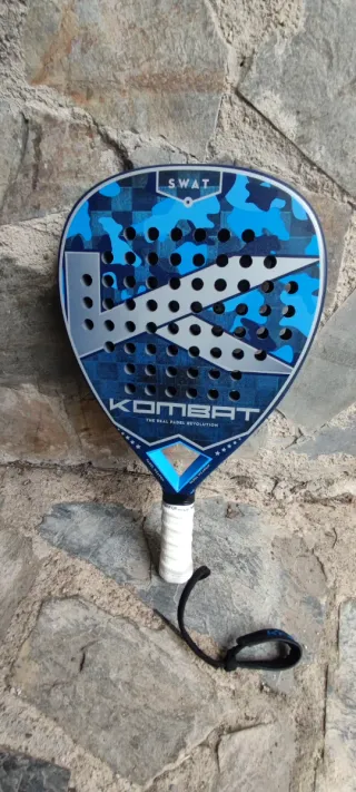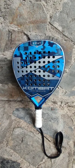 Pala de pádel Kombat Swat con un diseño moderno y llamativo. - Diseño en tonos azules y grises con camuflaje. - Logo de Kombat en grande en el centro. - Agarre blanco con cordón de seguridad negro. ESTADO IMPECABLE Sólo un leve salto de pintura como se aprecia en la foto que obviamente no afecta al juego. Funda y overgrip Wilson de regalo.