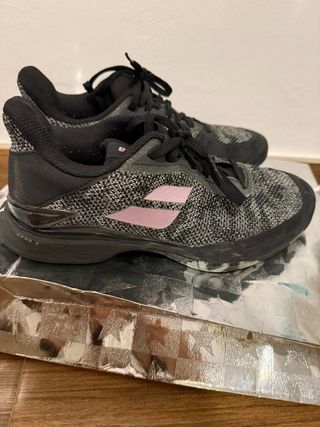 Zapatillas de pádel para mujer de la marca Babolat, modelo Jet. - Diseño moderno en tonos grises y detalles en rosa pálido. - Tejido transpirable en la parte superior. - Suela de goma Michelin para un buen agarre. Tienen 3 usos, casi nuevas!