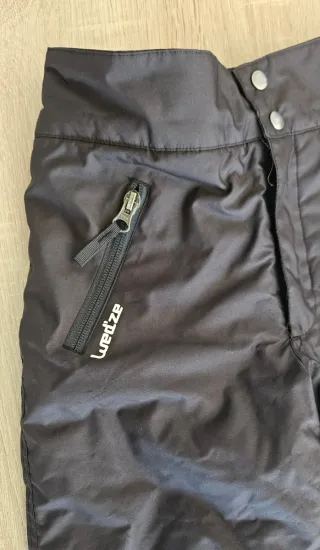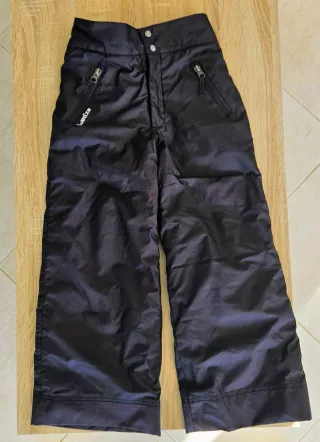 Pantalón cálido con interior polar, adaptable gracias a sus tirantes ajustables y desmontables, y a la cintura elástica. Costuras estancas y polainas cubrebotas que evitan la entrada de la nieve. Talla: 115-124 cm. 6 años - Color negro. - Dos bolsillos frontales con cremallera. La última foto muestra rasguños en los bajos, son superficiales.