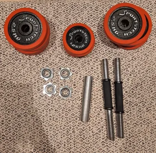 Set de mancuernas Sportstech con discos de diferentes pesos. - Incluye 4 discos de 2.5kg y 2 discos de 1.25kg. - Dos barras de mancuerna con mangos de goma. - Cierres de rosca para asegurar los discos.