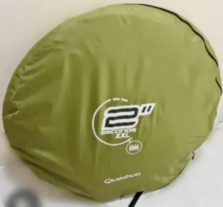 Tienda de campaña Quechua modelo 2 Segundos XXL, con capacidad para 4 personas. Es de color verde y viene en su funda circular. - Modelo: 2 Seconds XXL - Capacidad: 4 personas - Color: Verde - Incluye funda de transporte circular, protestantes bolsillo para piquetas. - Tiene asas como una mochila. - Bolsillos en el interio a los laterales - Fácil de cerrar, sólo hay que seguir las instrucciones cosidas en su interior - Techo con ventilación, se pueden abrir o cerrar botones para que pase más o menos aire. - De regalo alfombrilla para no ensuciar la habitación, piquetas extras y cuerdas (usadas con otra tienda)