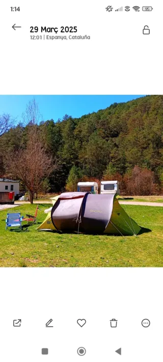 Vendo tienda de campaña modelo Quechua Arpenaz Family 4.1 en muy buen estado. Ideal para familias o parejas que buscan espacio extra. Características: Capacidad: 4 personas. Espacio: Tiene 2 habitáculos. Un salón de 5 m² donde se puede estar de pie (1,90m de altura), ideal para poner una mesa y sillas si llueve o para guardar equipaje. Una habitación amplia para dormir 4 personas. Montaje: Sistema de varillas clásico, muy intuitivo (varillas de colores). Impermeabilidad: Doble techo para proteger de la lluvia y la condensación. La he usado 2 veces. Está como nueva, no tiene roturas ni agujeros. La vendo por no usarla