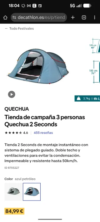 Con tan solo un uso. Está nueva. Peso: 3,4 kg, lo que la hace ligera y fácil de transportar. Estructura: Montaje automático con varillas, lo que permite una instalación rápida y sencilla. Ventilación: Doble techo y aireación en la parte posterior para mantener un ambiente fresco. Impermeabilidad: Diseñada para resistir vientos de hasta 40 km/h, ideal para condiciones climáticas adversas. Capacidad: Adecuada para dormir dos personas, aunque también se puede usar para uno solo. Estas características hacen de la tienda Quechua una opción popular para campings y actividades al aire libre.