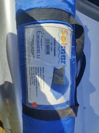 Tienda de campaña tipo iglú de la marca Solmar, modelo Tienda Sabana. - Tamaño: 210x210x130 cm. - Doble techo de poliéster 150 T. - Interior de poliéster 170 T. - Estructura con 2 varillas de fibra de vidrio de 7.9 mm de diámetro. - Suelo de polietileno (PE). - Incluye 6 cuerdas y 20 piquetas. Por las medidas juraría que es mínimo para 3 personas, pero no lo sé con seguridad. Me la regalaron y yo no la he usado, la he abierto y parece nueva completamente.