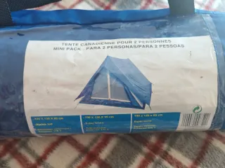 Tienda de campaña estilo canadiense. - Color azul. - Estructura de fácil montaje. - 2/3 plazas. - Doble techo impermeable. - Bolsa con piquetas/clavos y martillo de goma. Solo venta en persona.