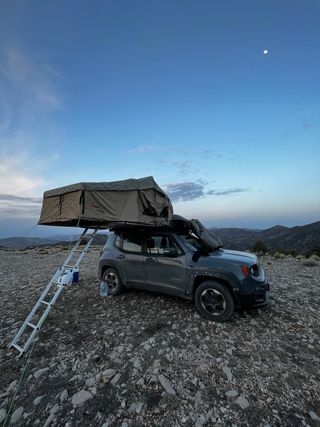Tienda de campaña de techo para vehículos. - Fácil de montar y desmontar. - Incluye escalera de acceso. - Ideal para acampada y aventuras al aire libre. Marca genara merzouga. Posibilidad de incluir la baca artesanal con espacio para equipaje ademas de accesorio para colgar hamaca, la baca se puede adaptar a las barras de techo de otras medidas, está fabricada para jeep renegade. Se puede poner en cualquier coche con baca aunque no sea todoterreno o 4x4