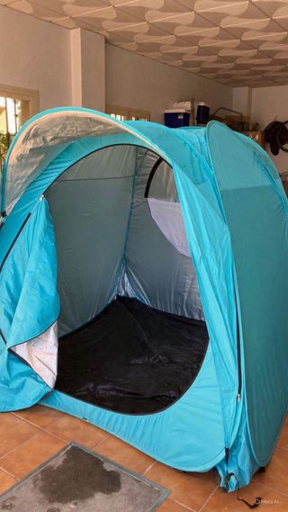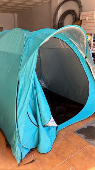 Tienda de campaña azul, fácil de montar y desmontar. - Diseño pop-up. - Color azul. - Interior espacioso. 200cm x 200cm x 180cm (ancho x largo x alto). tienda campaña camping segunda mano usada Quechua Decathlon Coleman Ferrino Vango ligera compacta plegable impermeable waterproof montaje rápido automática instantánea túnel iglú familiar personas 2 3 4 5 6 grande pequeña ultraligera trekking montaña playa festival coche techo hinchable resistente viento lluvia mosquitera avance suelo incluido outdoor aventura acampada vivac para festival festivales camino de santiago camper goretex 2 seconds
