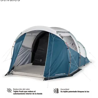 Tienda de campaña espaciosa, ideal para escapadas familiares. Fresh and black de decathlon. En perfectas condiciones. Vendemos con palos y piquetas extras. - Capacidad para 4 personas. - Diseño en color azul y blanco. - Estructura resistente.