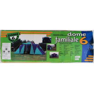 Tienda de campaña familiar para 6 personas con un amplio espacio de estar central. Sin usar (a estrenar). - Capacidad para 6 personas - Diseño tipo domo - Tres habitaciones - Zona de estar central (living) - Puerta con toldo - Color azul y verde - Dimensiones: 460 x 330 x 185 cm Solo venta en persona (no se hacen envíos).