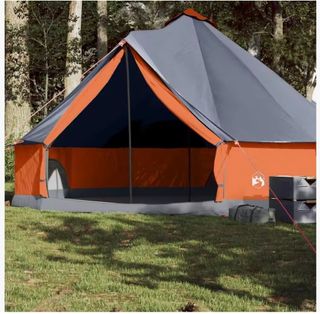 Tienda de campaña espaciosa, ideal para grupos o familias. - Capacidad para 4 a 8 personas. - Diseño en colores marrón, blanco y naranja. - Puerta con malla para ventilación. -Solo la hemos montado para la foto, está sin estrenar. -Me costó 165 euros. La vendo porque me ha tardado mucho en llegar y compré otra. -Súper fácil de montar