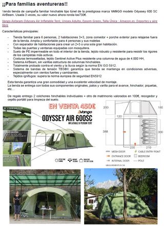 Vendo tienda de campaña familiar hinchable tipo túnel de la prestigiosa marca VANGO modelo Odyssey 600 SC AirBeam. Usada 3 veces, su valor nuevo ronda los 730€. Características principales en foto adjunta. De regalo entrego 2 colchones hinchables individuales + otro de matrimonio valorados en 100€, recogedor y cepillo portátil para limpieza del suelo.