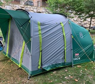 Tienda de campaña espaciosa, ideal para acampadas o eventos al aire libre. Fácil de montar y desmontar. - Diseño tipo túnel con varias estancias. - Incluye toldo frontal. - Ventanas para ventilación.