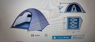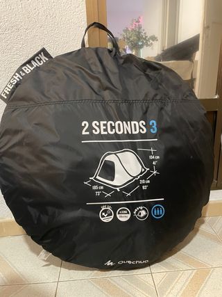 Tienda de campaña Quechua modelo 2 Seconds para 3 personas. Es compacta y fácil de transportar. Se monta en 2 segundos (literalmente se lanza al aire y se abre sola, solo falta que fijarla al suelo) se guarda muy rapido tambien (5 minutos contando con sacar las piquetas) muy facil de guardar ya que en su funda mide Ø76cm x 12cm. Abierta 180x210x104 (ancho x profundo x alto). La usamos una sola vez. Esta perfecta. Busca en la web de decathlon para ver todos los detalles y como es por dentro. Precio original 90€