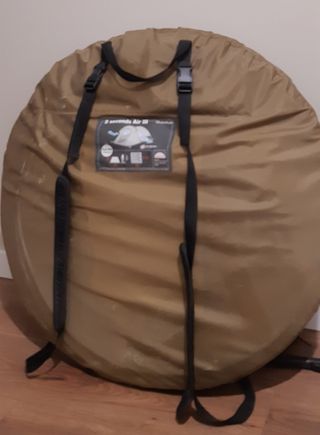 Tienda de campaña QUECHUA 2 seconds Air III. Con sistema Air Cooling. Para tres plazas; pesa 4.6 kilos y se puede transportar como si fuera una mochila (aunque es una circunferencia, se transporta muy comodamente). Tiene bastantes años, pero apenas está utilizada. Muy práctica y fácil de montar y desmontar.