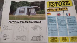 Tienda de campaña grande, tipo chalet, de las de antes, de lona fuerte. Dispone de 3 amplios dormitorios, avance cerrado y porche cubierto. Cada conjunto de mástiles está unidos por muelles, por lo que el montaje es muy sencillo (foto 8). Los dormitorios se colocan fácilmente con clips (foto 4). Está en muy buenas condiciones, solo tiene unas pequeñas manchas de cacas de pájaro en una esquina (foto 10). Se puede ver en San Medel (Burgos).