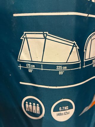 Tienda de campaña modelo T4.1, ideal para actividades al aire libre. Se puede estar de pie en el porche debido a su altura. Tengo dos unidades, una individual la vendo por 85, las dos tiendas 150 euros. - Peso: 10,7 kg. - Material: Poliéster con recubrimiento PU.