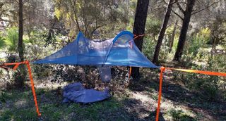 Tienda campaña colgante, fijación en 3 puntos. Doble techo. Ideal para dormir retirado del suelo. Capacidad para una persona.