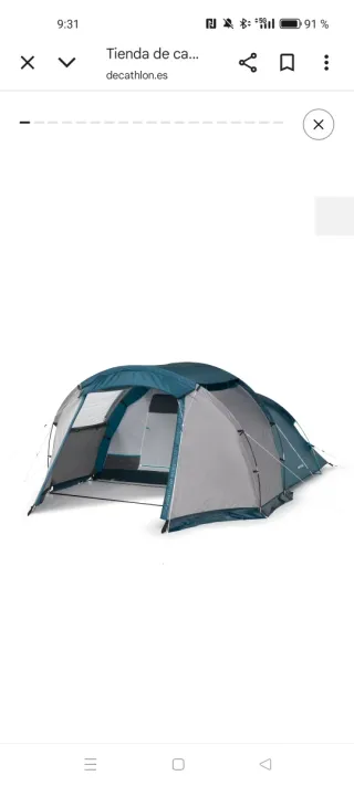 Tienda de campaña Quechua para seis personas, 3 habitaciones. Se encuentra en perfecto estado, no entramos nunca con zapatos, solo una minima raja en visera por dentro, arreglada y no se ve (última foto). Mosquiteras y todas las cremalleras van perfectas - Capacidad para 6 personas. - Es fresh and black ( fresco y oscuro si cierras ventanas), para 6 personas y ya no venden este modelo que está genial y es muy versátil La hemos usado solo 4 veces - precio original 500 €
