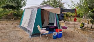 Tienda de campaña espaciosa y cómoda para toda la familia. Ideal para disfrutar de la naturaleza y el aire libre. - Diseño espacioso. - Incluye accesorios para su montaje y uso. También se llevaría 2 colchones de aire+ otros 2 que regalaria+ 2 sacos de dormir+ nevera+ kilos de platos, vasos y cubiertos+ cantimplora + botella gas con su ornillo + linterna +2 sillones+2 sillas plegables+ suelo con clavos para sujetarlo al suelo y además unas picas de hierro macizo para clavar en cualquier terreno. Cuerdas, instalación de luz para tienda...osea todo lo necesario para ir de camping.