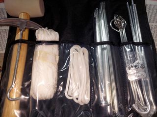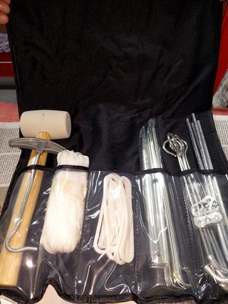 Juego de accesorios para tiendas de campaña. Incluye: martillo, cuerda, piquetas y tensores. Todo en perfecto estado y listo para usar. - Martillo de goma con mango de madera. - Cuerda de nylon blanca. - 8 piquetas metálicas. - Tensores de plástico blanco.