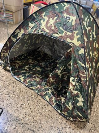 Tienda de campaña con diseño de camuflaje militar. Es fácil de montar y desmontar. Largo 115 cm Alto 133 cm Ancho 180 cm - Patrón de camuflaje. - Material resistente.