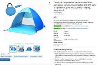 El articulo es original, y se han comprado en la tienda de la marca o distribuidor autorizado y esta sin usar y esta empaquetado de fabrica. * Se despliega automáticamente en segundos, sin necesidad de montar. * Tejido de poliéster recubierto para resistencia al agua y protección solar. * Se pliega de forma compacta y almacena la bolsa incluida para un fácil transporte. Clasificación de protección solar: UV 50+. Tamaño aproximado: 165 x 150 x 110 cm.