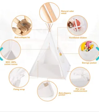 Tienda de juegos para interior y exterior. Tiene una ventana, dos bolsillos para colocar cosas y la puerta con solapa se puede cerrar. Es de algodón y de color blanco. Su tamaño es de 120 x 120 x 150 cm. Tiene una manta acolchada para el suelo. Fácil de montar y desmontar.