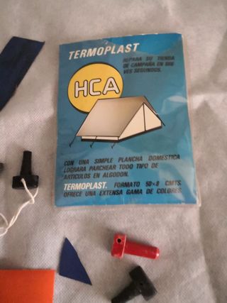 Kit de parches Termoplast HCA para reparar tiendas de campaña. Ideal para solucionar pequeños desperfectos. El kit incluye varios parches de diferentes colores y tamaños, además de tapones. Los materiales se ven en buen estado. - Incluye varios parches de colores rojo y azul. - Se incluyen también tapones de colores rojo y negro. - Perfecto para pequeñas reparaciones.