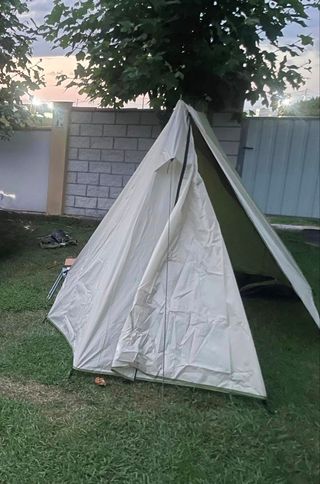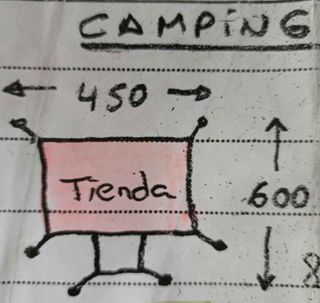 Vendo tienda de campaña. Tiene muchos años, pero se ha usado dos veces (2 veces!). Está completamente nueva. Ningún desperfecto. Lleva años guardada en el trastero, en perfecto estado, en ambiente seco y protegida. En la foto se ve el tamaño. No tengo las medidas de la tienda, pero en el croquis adjunto se indica que incluidos los vientos (tirantes) es de 4,5 metros x 6 metros. Por el peso mejor entregar en mano, en Valladolid, Madrid o Santander. Ver fotos.