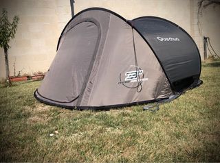 tienda de campaña de las que se montan solas, es muy amplia por dentro y se recoje en dos movimientos. Queda recojida en una bolsa que se transporta facilmente y aunque no pesa te la puedes poner como mochila.