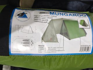 Vendo tienda de campaña MUNGAROO. Está en perfectas condiciones y lista para usar. 3 personas Avance alta protección UV. -Columna de agua de 3000 mm. -Material: poliéster con revestimiento de PU, costuras selladas. -Varillas de acero de 16/19 mm. Usada una sola vez, muy fácil de montar, ligera y resistente. La vendo por qué acabo de comprar una más pequeña para viajar en moto Está perfecta