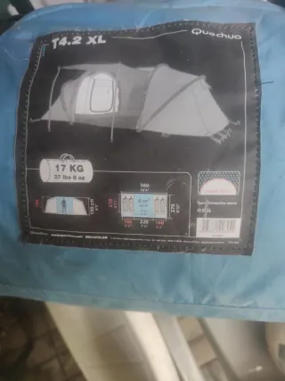 Tienda de campaña Quechua T4.2 XL con capacidad para 4 a 6 personas. Ideal para acampadas y actividades al aire libre. Usada 2 veces - Modelo: T4.2 XL - Capacidad: 4-6 personas - Peso: 17 kg (37 lbs 8 oz) - Dimensiones (largo x ancho x alto): 560 x 270 x 210 cm - Superficie: 6 m² (habitable) + 2 m² (vestíbulo) - Color: Azul