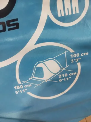 Vendo tienda de campaña para dos personas, pesa 3kg. - Ideal para excursiones de fin de semana. - Ligera y fácil de transportar. - Diseño compacto. Tiene el suelo rajado en una esquina y arreglado con cinta americana (ver fotos)