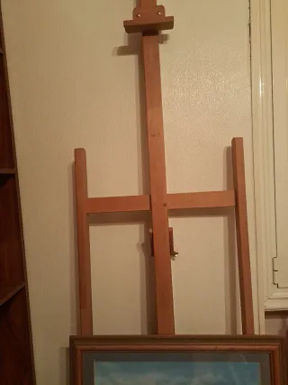 Caballete de madera para artistas, ideal para sostener lienzos de tamaño mediano. - Construcción robusta de madera. - Diseño plegable para fácil almacenamiento y transporte. - Ajustable en altura para mayor comodidad. Comprado en tienda Sorron de Tolosa No se hace envíos