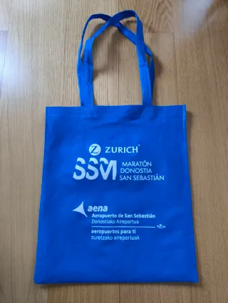 Bolsa de tela azul conmemorativa del Maratón de San Sebastián. - Diseño con logos de Zurich y Aena. - Incluye texto en euskera y castellano. Bolsa que te dan en meta.