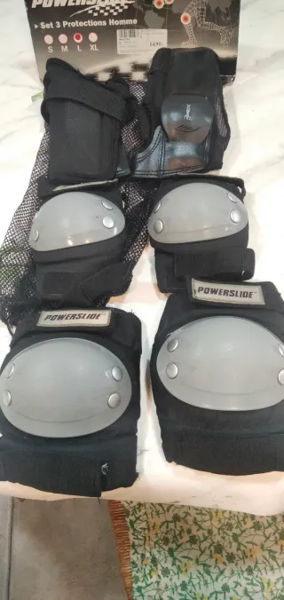 Set de protecciones Powerslide para patinaje. Incluye rodilleras, coderas y muñequeras. Talla L. - Diseñadas para ofrecer protección. - Cierre con velcro ajustable. - Marca: Powerslide.