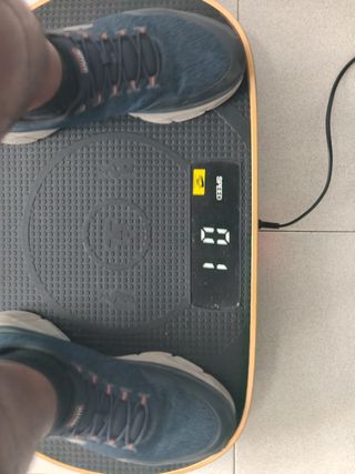 Plataforma vibratoria MERACH en color negro con detalles dorados. - Diseño ovalado. - Superficie antideslizante con textura. - Base negra con soportes de goma. con su cable y su mando. en excelente condiciones