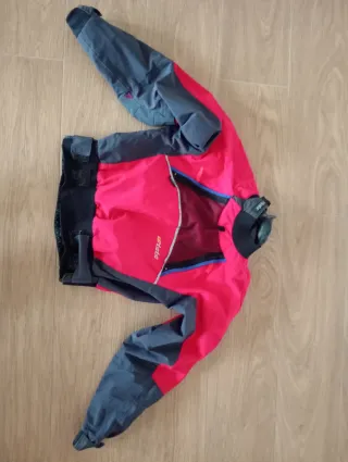 Anorak piragua Los puños de latex estan perfectos y no tiene agujeros. Pero el cuello de latex se ha rajado y esta viejito ya de ahi su precio. Pero aun vale para primavera verano en dias que no haga frio. El cuello se cierra con velcro Talla M