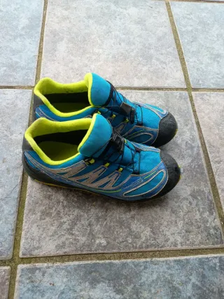 Zapatillas de senderismo Salomon en talla 38 2/3. Diseñadas para ofrecer comodidad y rendimiento en exteriores. El las fotos se ven los signos de desgaste - Cierre rápido con sistema de cordones. - Detalle de logo de la marca en el lateral. - Parte superior con detalles en gris y amarillo. - Suela de goma para un buen agarre.