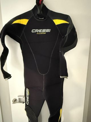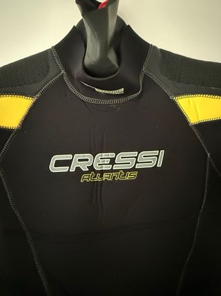 Traje de neopreno Cressi de 5mm, ideal para actividades acuáticas. - Color negro con detalles amarillos. - Marca: Cressi. - Modelo: Atlantis.