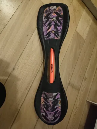 Patinete de dos ruedas con un diseño moderno y llamativo. - Color principal negro con detalles morados y naranjas. - Superficie antideslizante en las plataformas. - Barra central naranja con el logo de Oxelo.