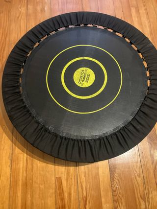 Cama elástica Domyos Fit Trampo100. - Diseño circular. - Cubierta negra con detalles amarillos.